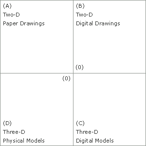So, imagine, if you will, a 2X2 matrix with the quadrants labeled "Two-D Paper Drawings (A), Two-D Digital Drawings (B), Three-D Digital Models (C), and Three-D Physical Models (D)" (reading clockwise from the upper left quadrant).